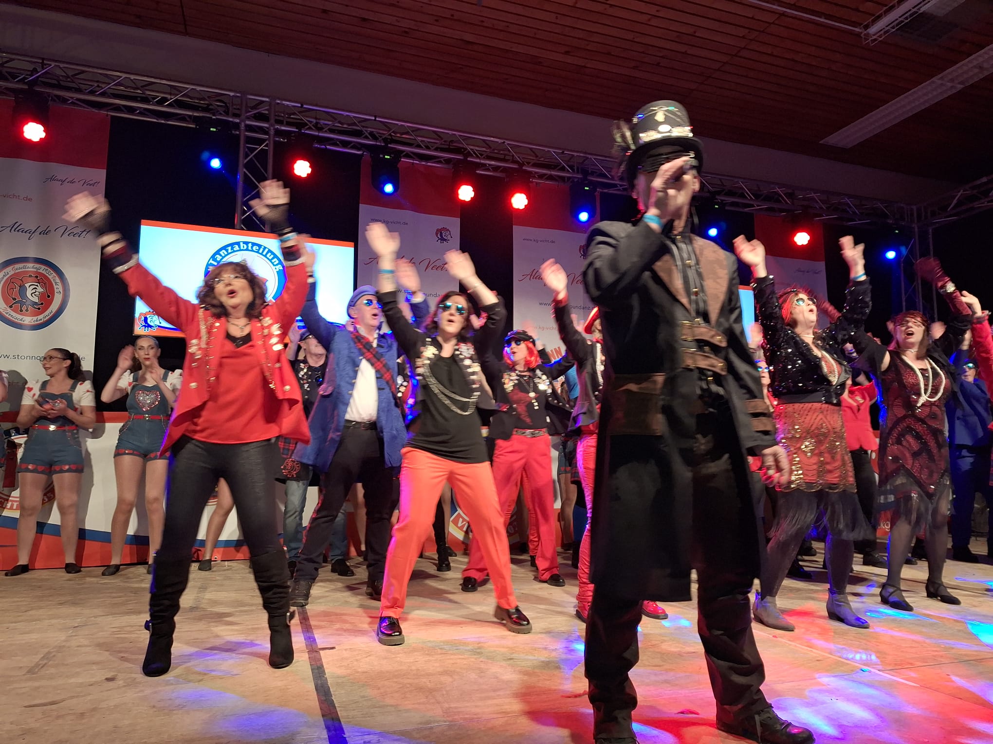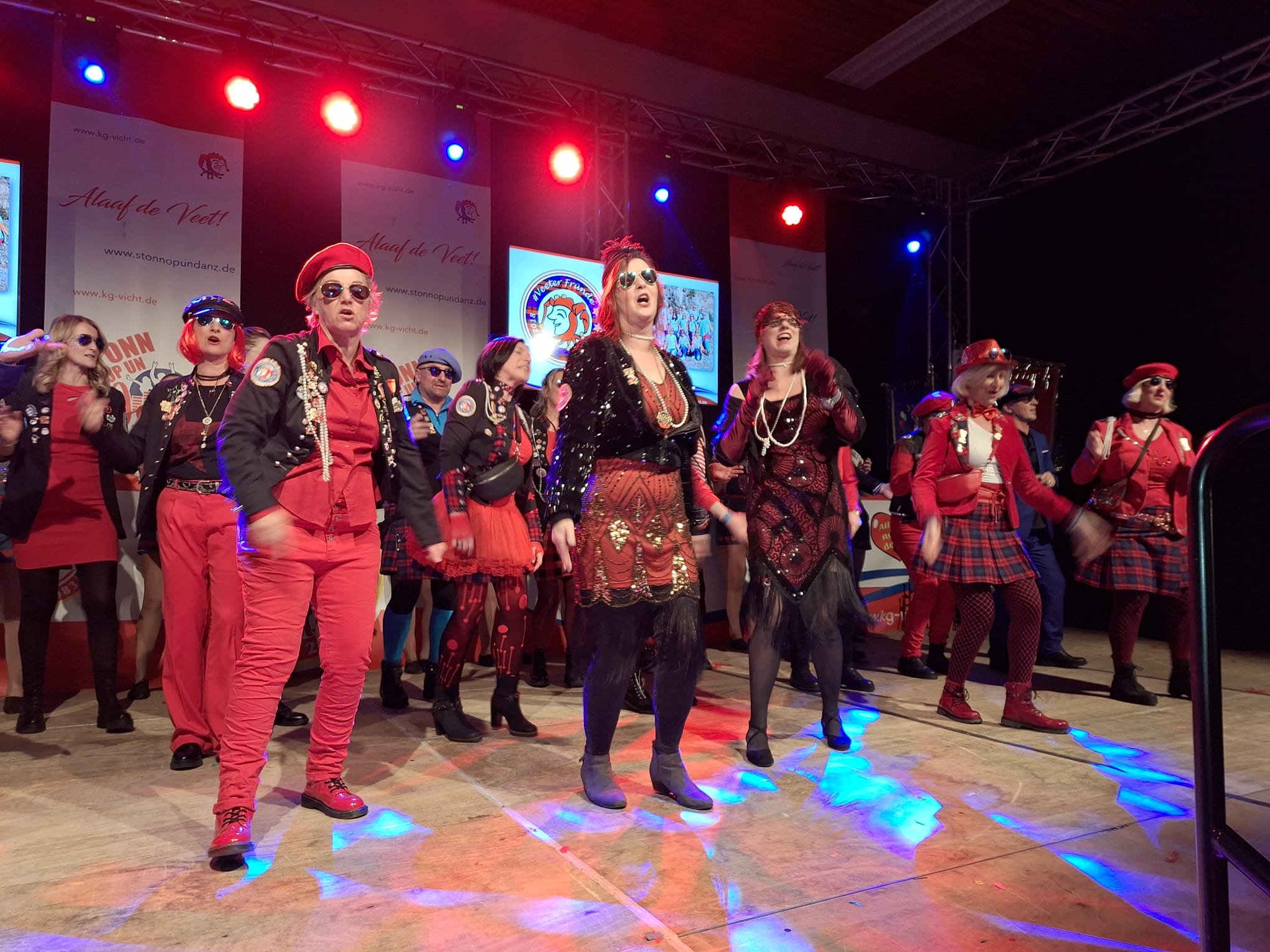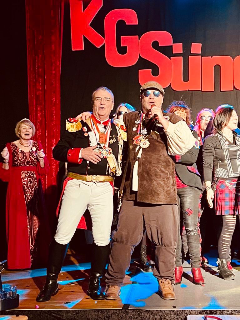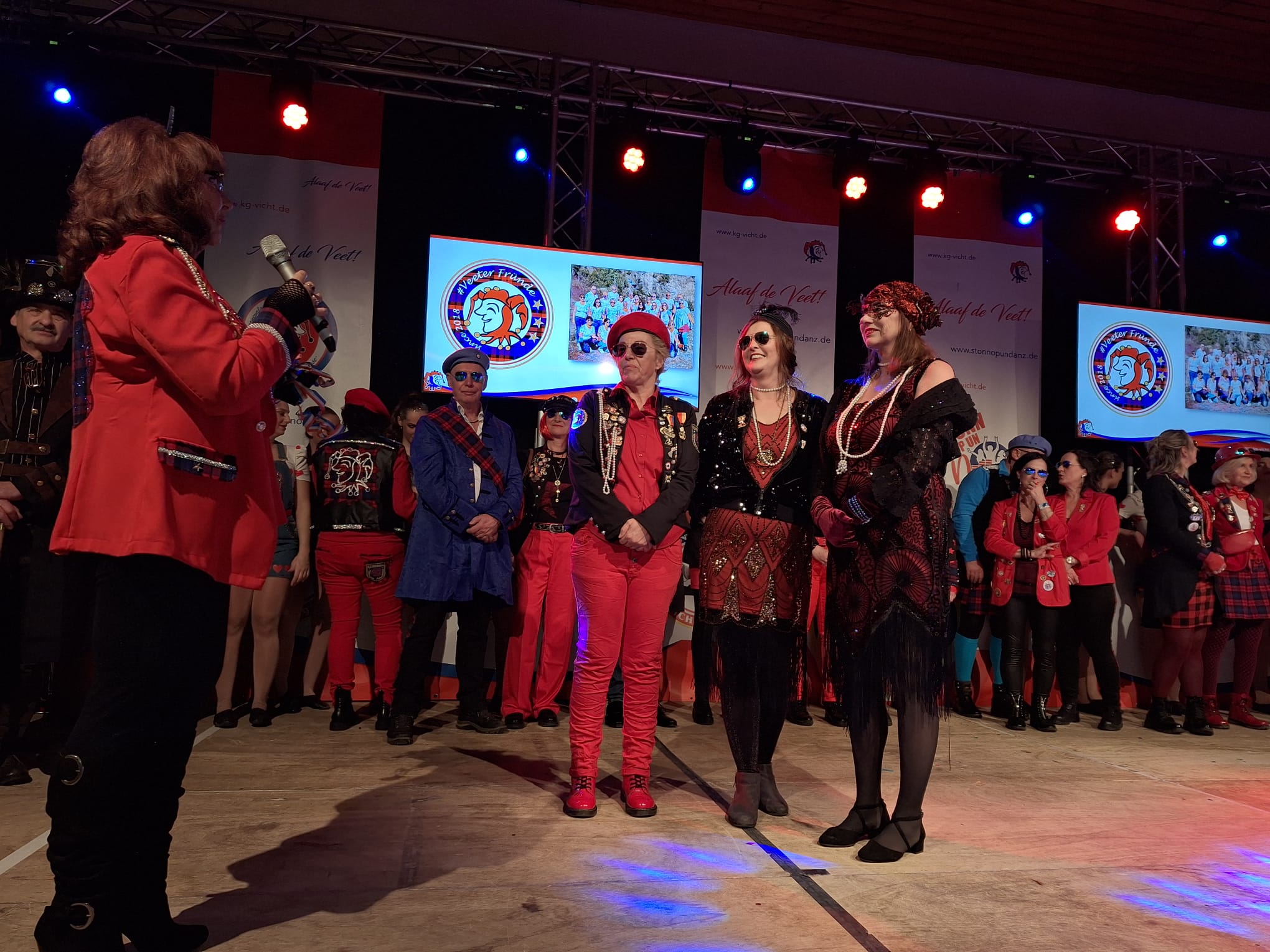 Die Veeter Fründe studieren jede Session einen neuen Auftritt ein, bei dem ein Medley aus aktuellen oder auch bekannten Stimmungslieder selbst eingesungen und dann als Showeinlage dargeboten wird. Nicht perfekt .... aber „Spaß an der Freud" ist was zählt.