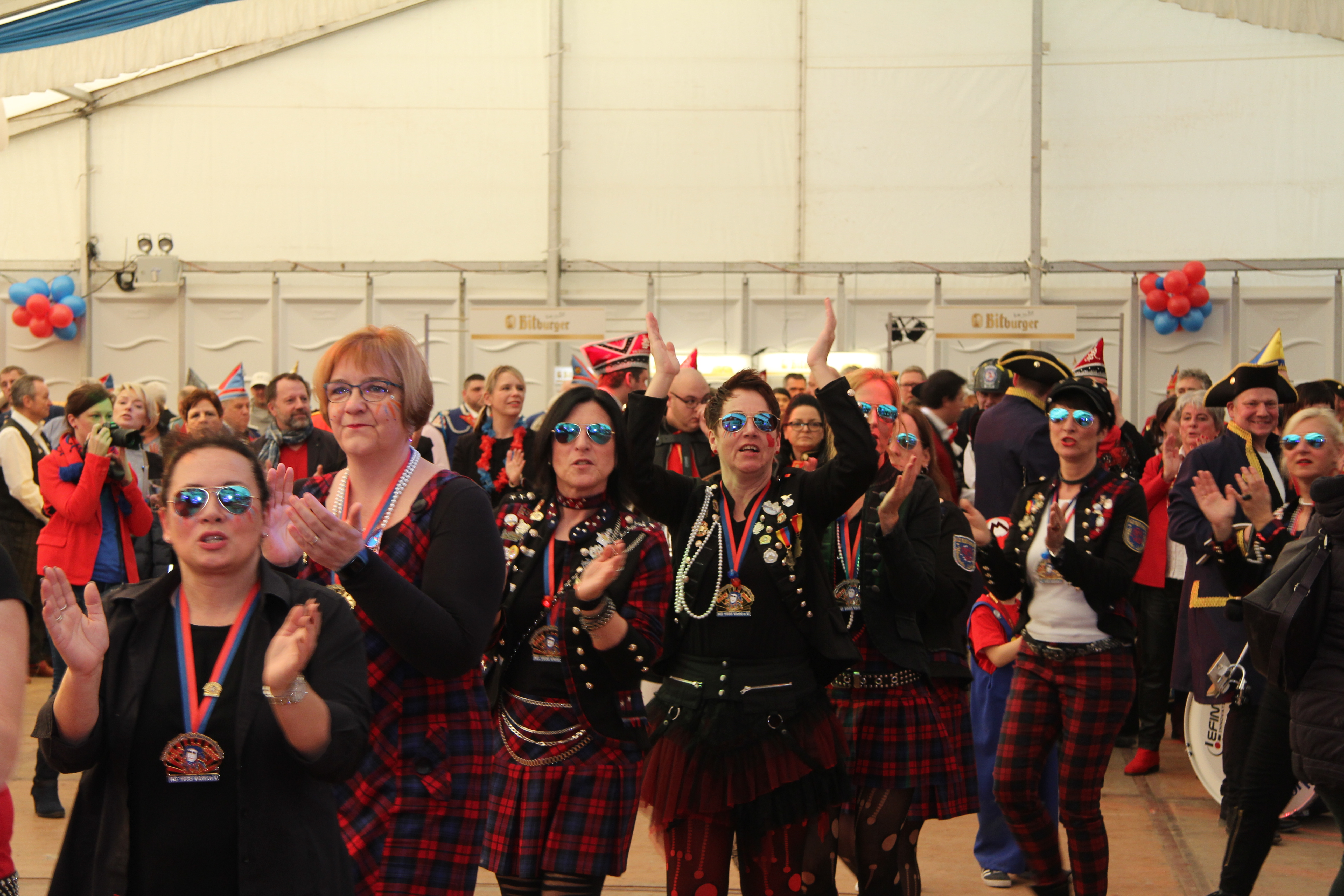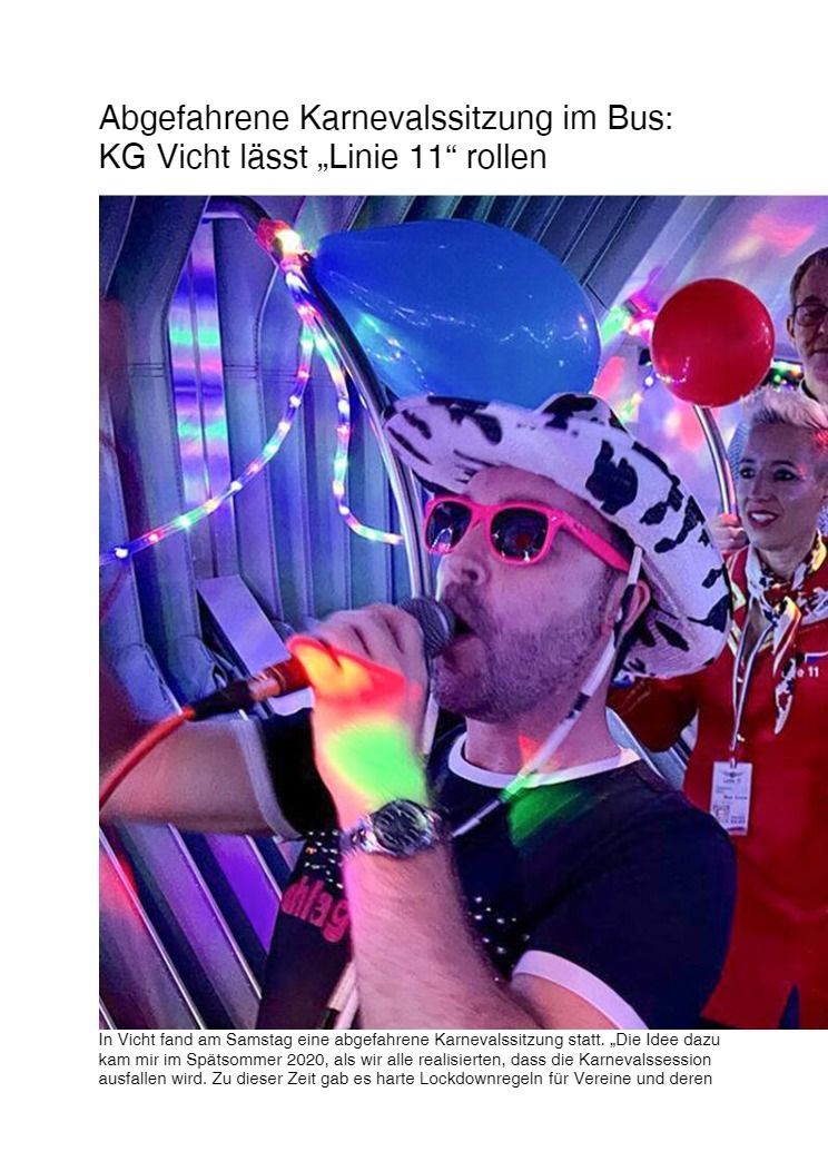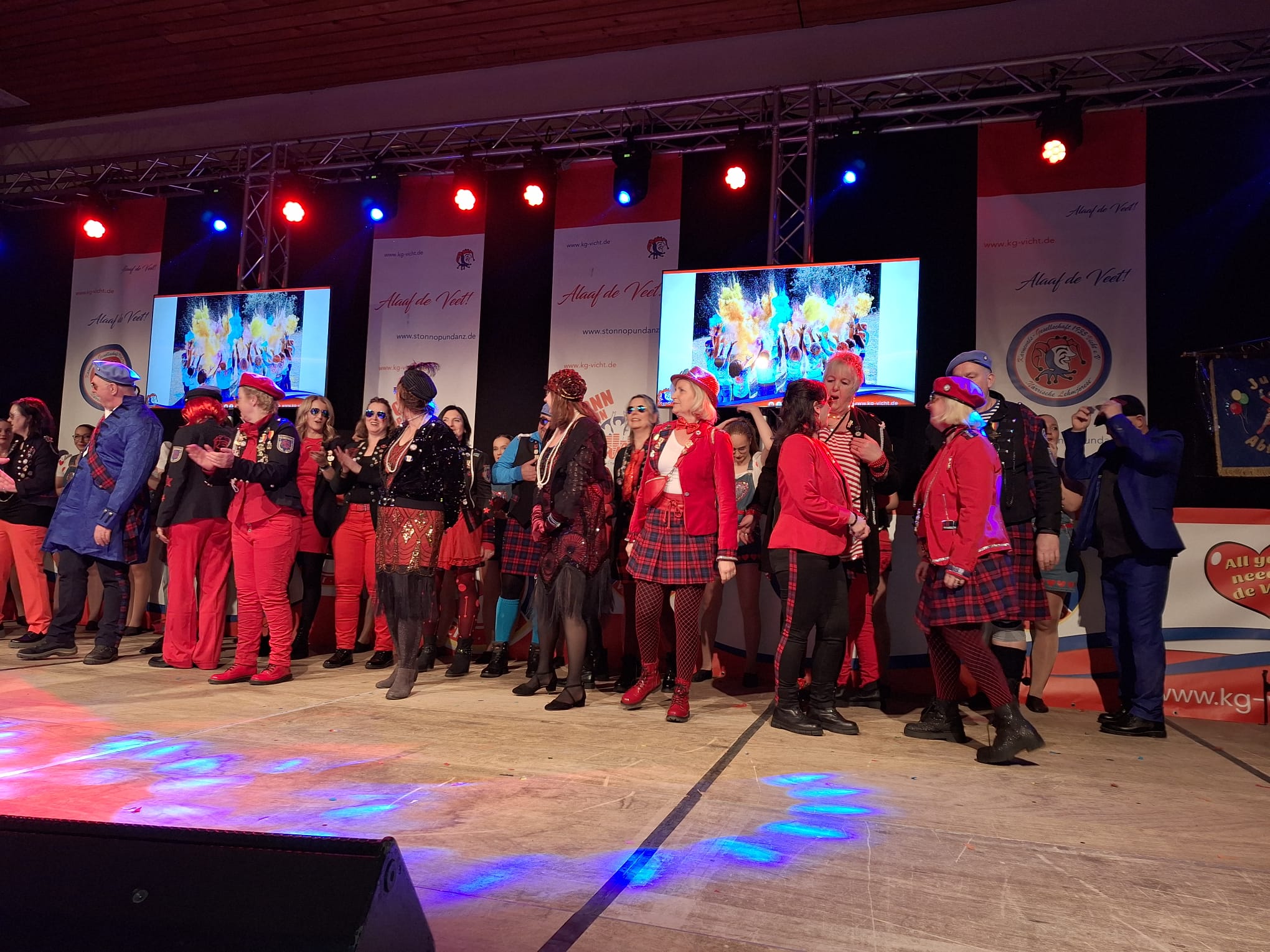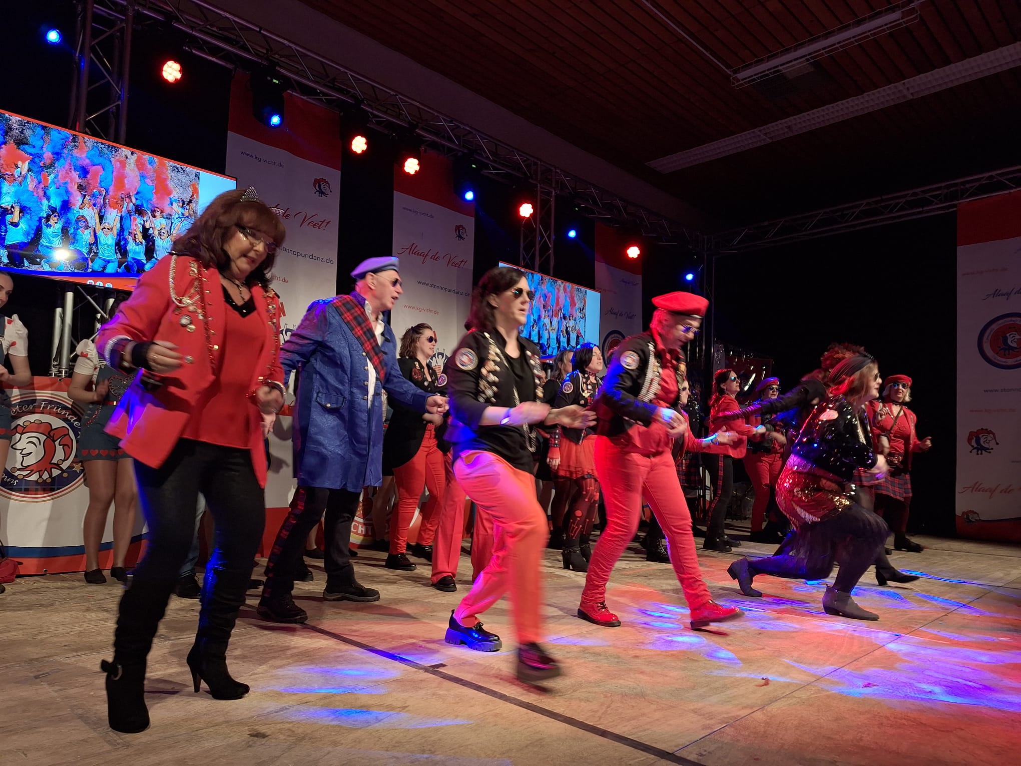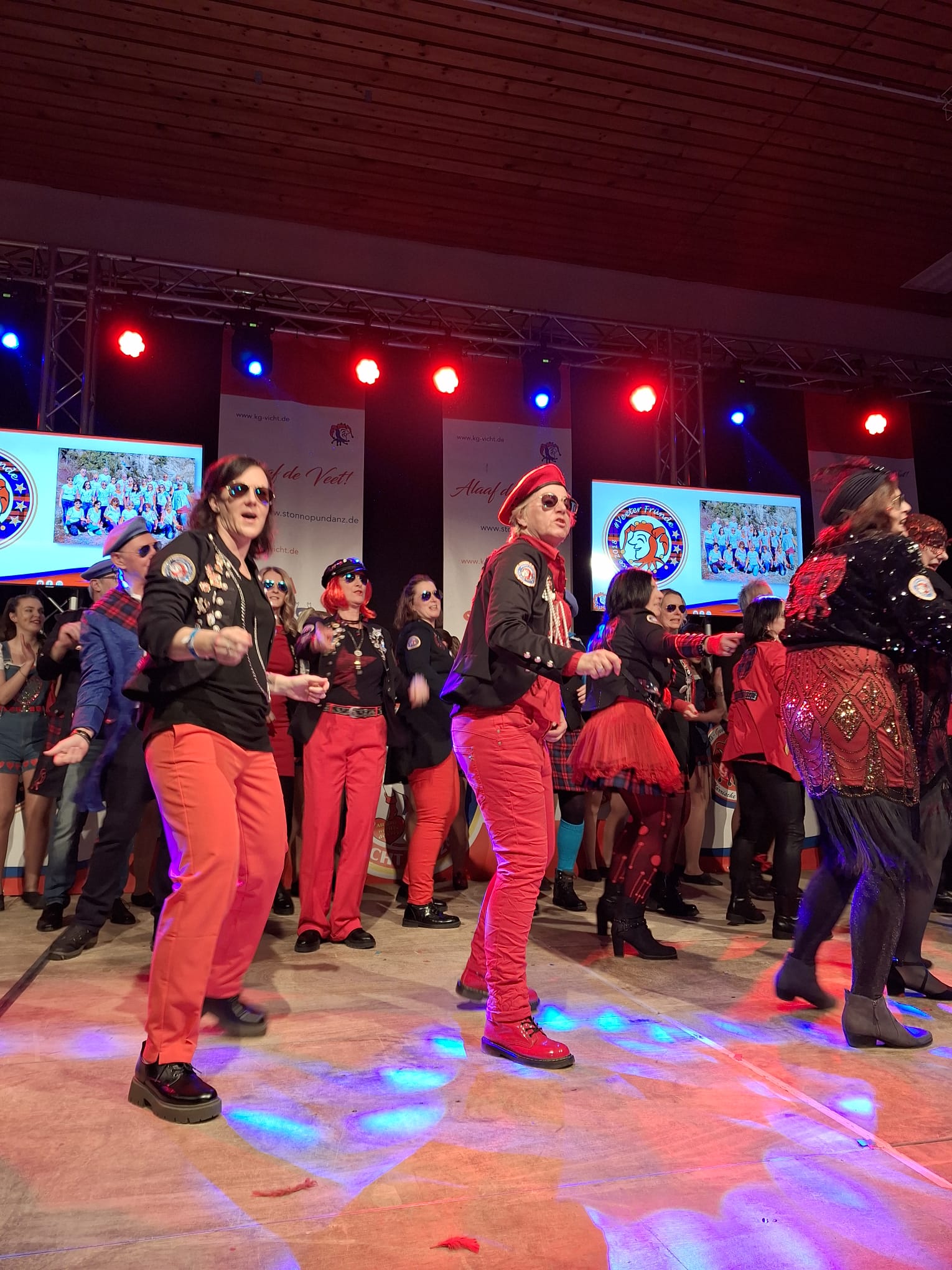 Die Veeter Fründe studieren jede Session einen neuen Auftritt ein, bei dem ein Medley aus aktuellen oder auch bekannten Stimmungslieder selbst eingesungen und dann als Showeinlage dargeboten wird. Nicht perfekt .... aber „Spaß an der Freud" ist was zählt.